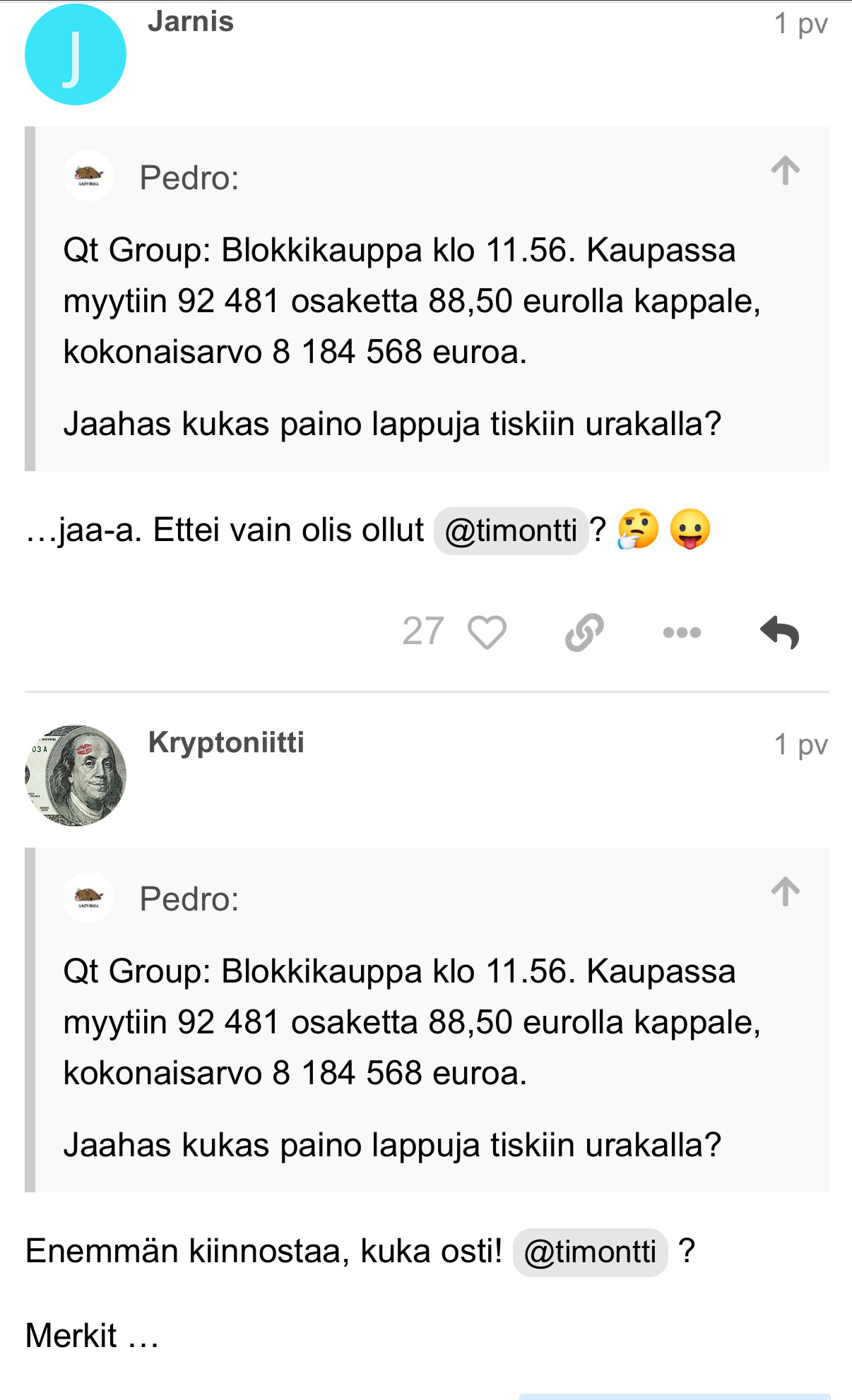 Niin karhut, härät ja muut siltä väliltä ovat toivoneet asiallisempaa sekä sisältörikkaampaa sijoituskeskustelua, lisäksi näissä molemmissa ketjuissa on ollut joskus vähän ongelmia. ![]()