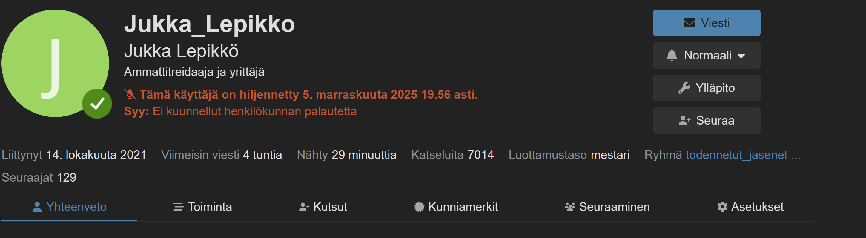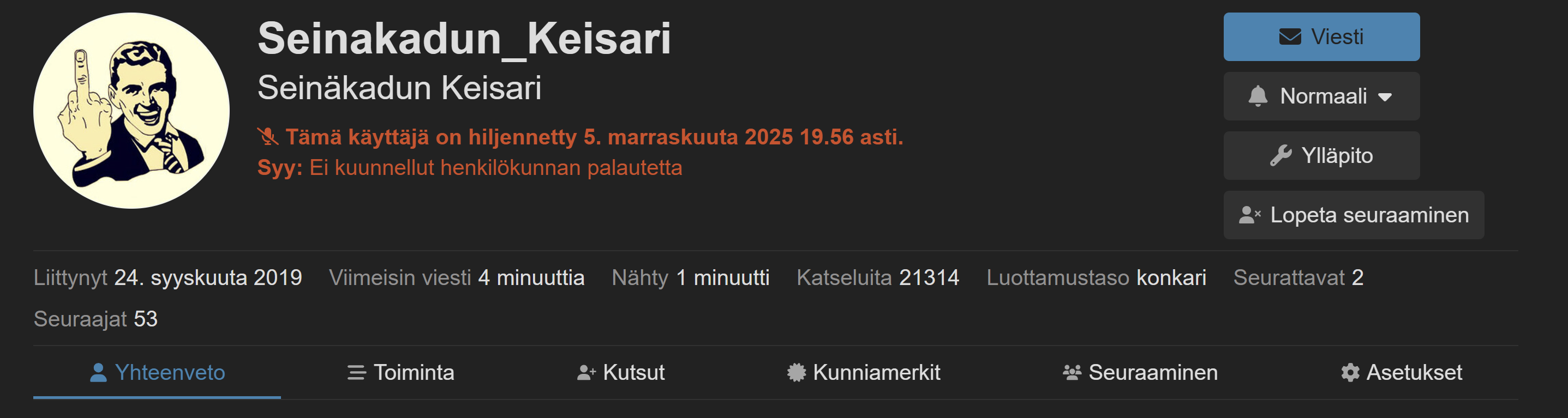 Lievä hämmennys tulee siitä, kun joku nostaa esiin, kuinka paljon hyvää nyt bannattu henkilö tuo keskusteluun. No niin tuo (!) mutta eihän se hyvänen aika voi vaikuttaa mitenkään asiaan. Että sen vuoksi olisi ihan ok esim. halventaa muita?! Säännöt pitää olla samat kaikille, vaikka sitten verneripulkkisillekin.