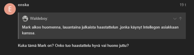 Of course it was a reasonable question, and such a message should naturally not be moderated away. An essential question that clarifies how anyone interested in the company can watch the interview. Information that the person who first mentioned the interview should have provided without even being asked. An absolutely absurd comment from the moderator to demand “a little something else” for that.