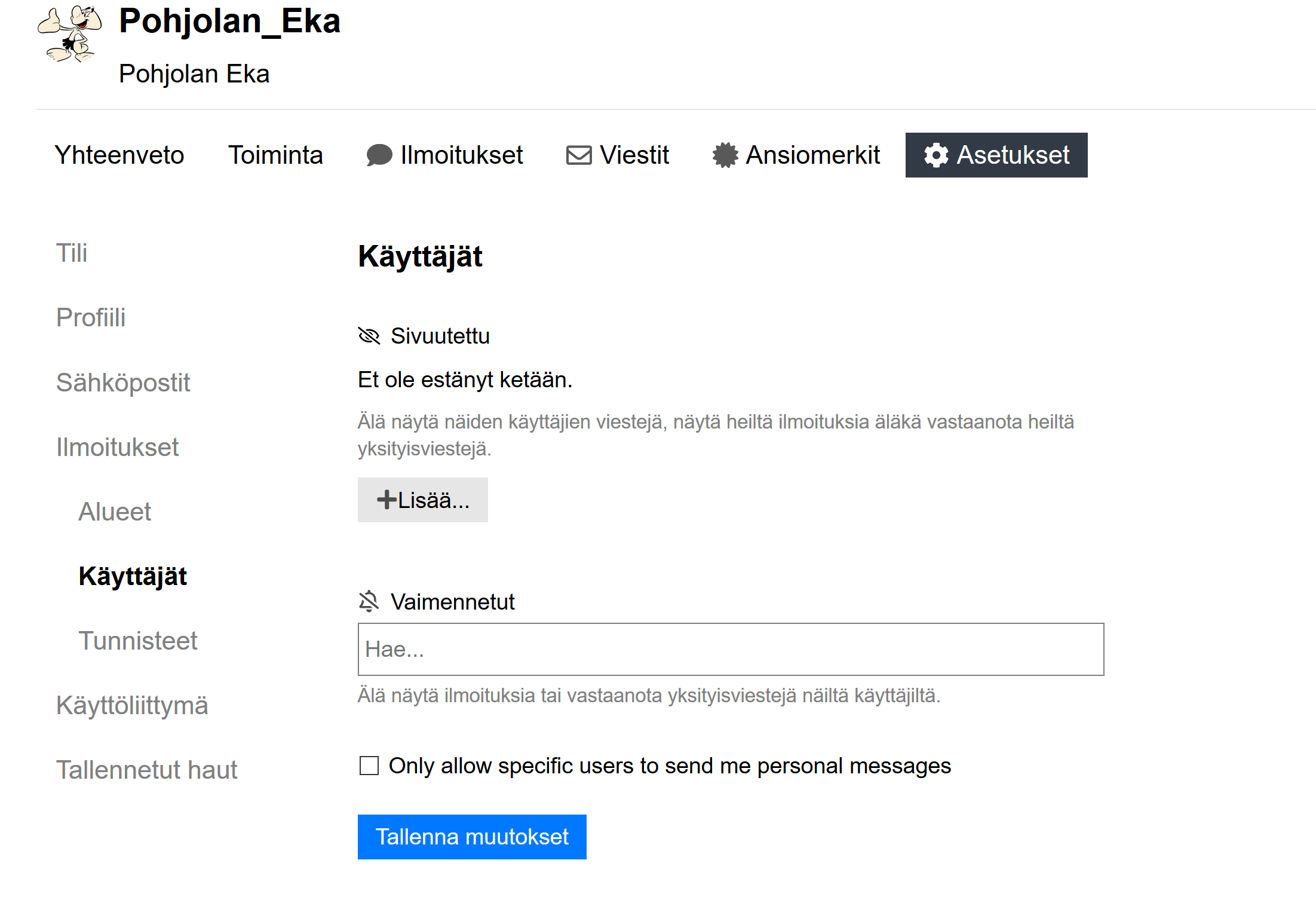 Löytyy myös asetuksista. Täällä on yllättävän paljon hyviä ominaisuuksia mitä ei välttämättä tule huomattua jos ei erikseen käy tutkimassa. Mielestäni tämä ei sinänsä ole liputusta korvaava toiminto, sillä liputuksella teet palstasta paremman paikan kaikille siinä missä estolistaa käyttämällä parannat vain omaan kokemustasi.