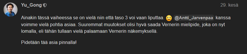 @Verneri_Pulkkinen@Yu_Gong Tähän oma ehdotukseni olisi, että esim. värikoodein voisi merkkailla off-topiciksi. Tai sitten voisi lisätä Facebook-tyylisen kommentoiti tilan jokaisen asiallisen vastauksen alle, jossa voisi olla vähän vapaampaa keskustelua.