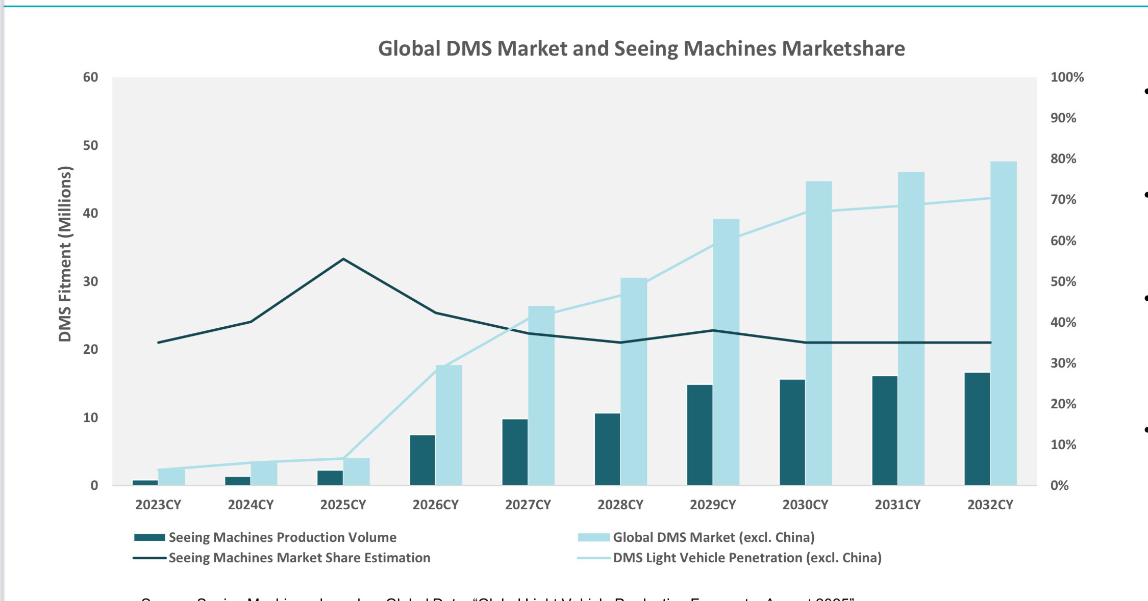 Since I’m already on a gloomy note, let’s continue. Smart Eye has set its target and guidance for a market share of over 40 percent. Market share is measured by Design Wins, and in this regard, I don’t think there is cause for concern. However, if we look at Smart Eye’s three largest potential customers, they are mostly located outside Europe—namely GM, Ford, and Toyota. Similarly, of those currently in production, the Hyundai Group is clearly the largest, and they are also stronger outside Europe than within it. Only the fourth largest, Stellantis, sells primarily to Europe. Stellantis is a shared account with Seeing Machines. Smart has a good number of Design Wins with Stellantis—about 60—and I calculated that Stellantis has about 100 car models that the Design Wins could apply to. Some Design Wins extend into future years, but one could perhaps think that Stellantis is split roughly in half with the competitor. As a result of all this, Smart’s market share in Europe is clearly smaller than in other developed markets, excluding China. I am confident that growth will be sufficient for positive cash flow with a reasonable margin already this year, but a large part of the growth will come even later. Seeing Machines describes the changes in the market and market shares for cars in production as shown below. Smart Eye’s market share isn’t a perfect mirror image, as BMW shifted/is shifting to Tobii, the Chinese share will grow in the market, and perhaps Mobileye will manage to capture a slice for themselves, but it’s quite close regardless.