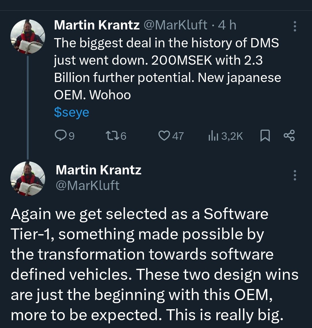 Heitit varmasti heittona Scanian mutta en malta olla kirjoittamatta, että Smart Eyella on oletettavasti DMS Design Win Scanian omistajan Tratonin kanssa. Scania on myös läheinen kumppani SEYEn kanssa, joten heidän kanssaan olettaisin pullien olevan hyvin uunissa. Kehittelevät yhdessä turvallisuusjärjestelmiä, vaikka ei se tietenkään tarkoita sitä, etteikö muiltakin voisi tulla Design Winejä tai muita kumppanuuksia.