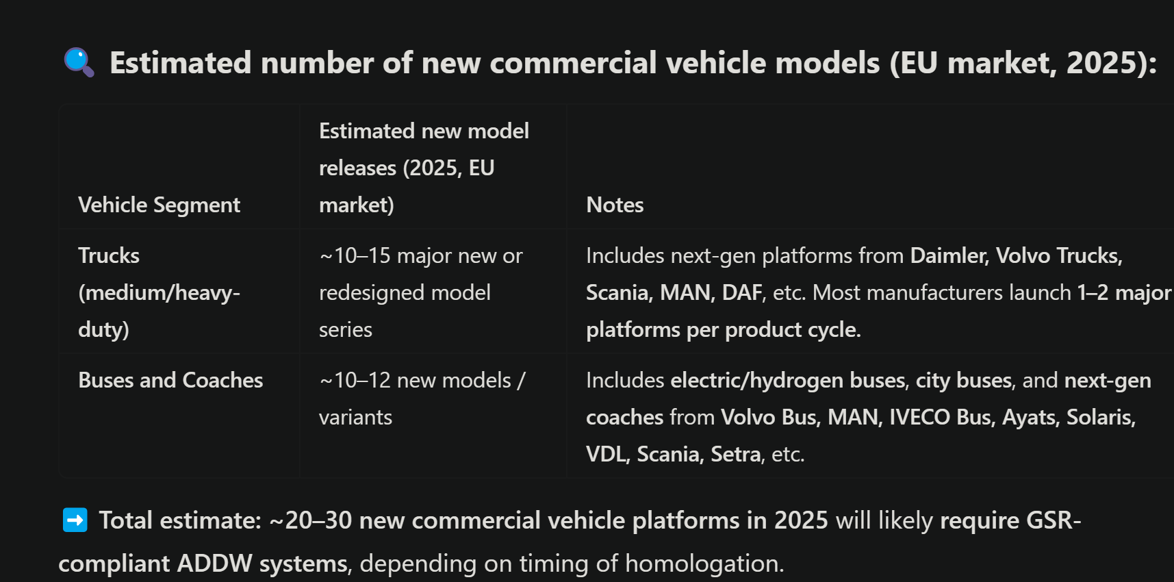 The new contract announced today includes two design wins for a total value of SEK200m related to a Japanese OEM (Redeye prediction: Toyota). The models are scheduled to start production by mid-2027, and the estimated future additional design wins increased by a net of SEK2.4bn to a total of SEK5,715m.