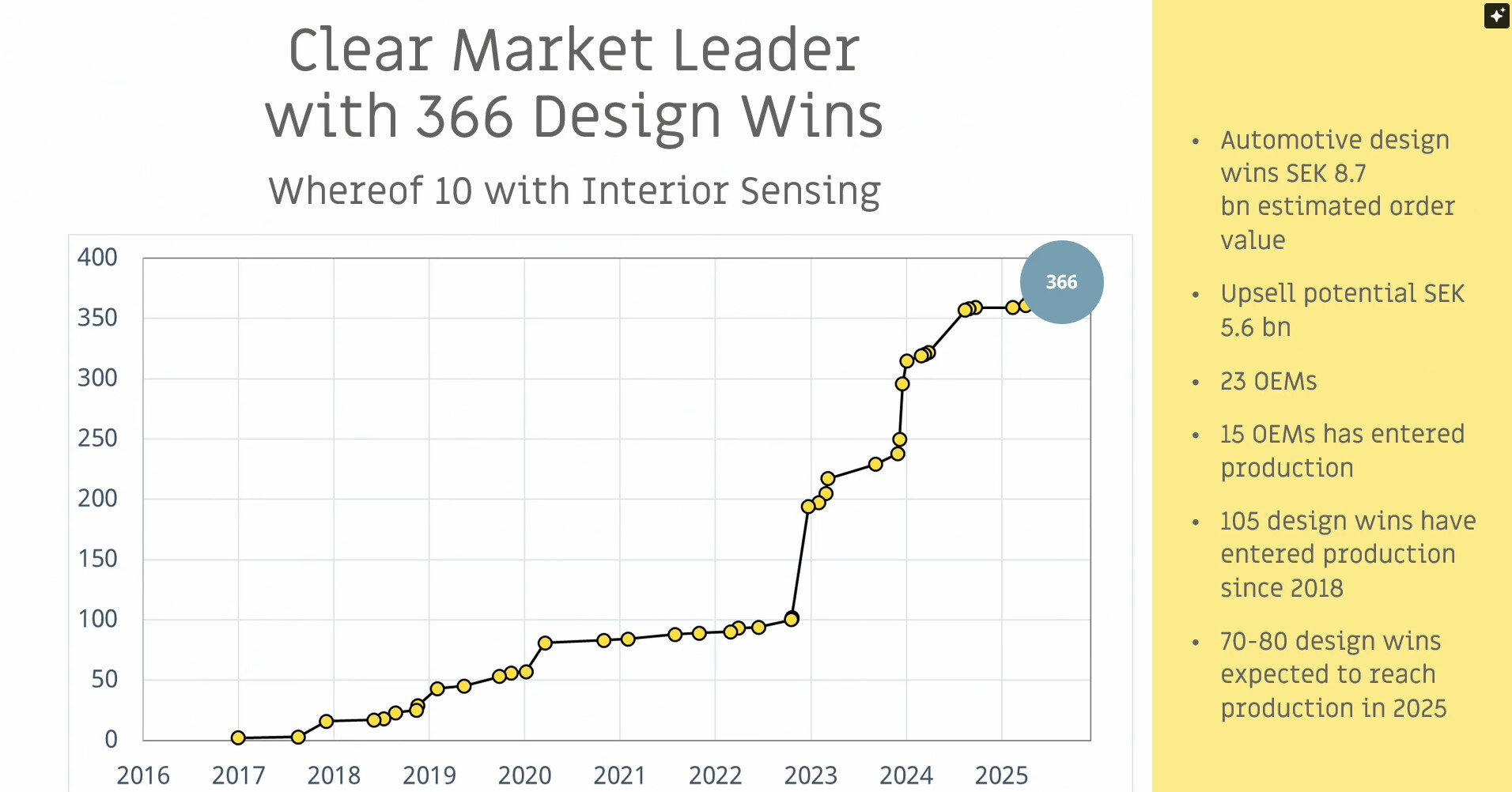 Nyt ensi vuoden poikkeuksellista kasvua selittää suurimmalta osin Euroopassa kesällä pakolliseksi tuleva kuljettajan seuranta. Jokaisessa myytävässä autossa pitää olla tuo teknologia sisällä. Kun aiemmin edistynyt kuljettajan seuranta on painottunut matalamman volyymin premium-hintaluokkaan, jatkossa se pitää löytyä myös edullisemmista massamalleista.