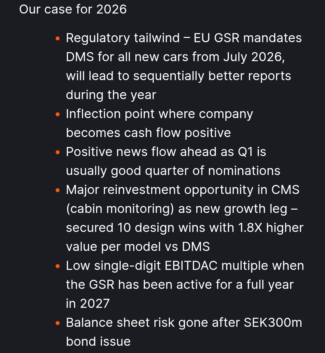 We view this as a meaningful milestone, not only for Smart Eye, but for the automotive safety ecosystem more broadly. This is the first time an OEM has taken the step from theory to deployment when it comes to camera-based alcohol impairment detection. In our view, this is unlikely to remain an isolated case. While adoption will not happen overnight, we expect spillover effects as other OEMs observe both how technically undemanding the feature is in terms of processing power, and the regulatory benefits of implementing similar functionality, such as EURO NCAP scoring.