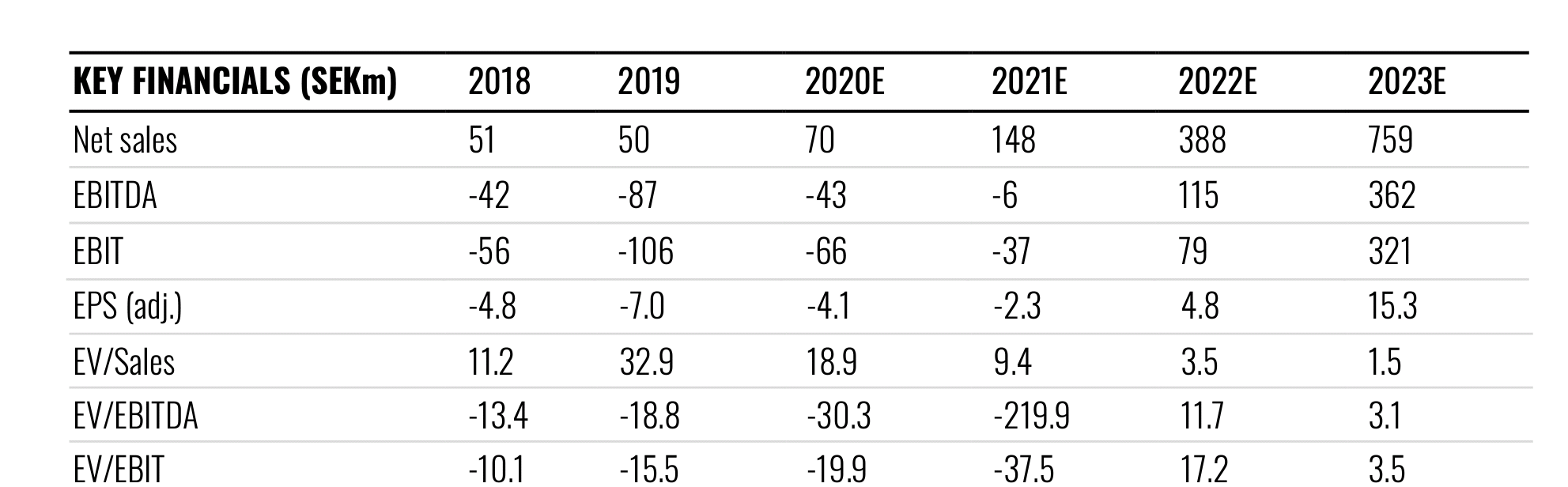 Yhtiön liikevaihto on tänä vuonna (2020) tasolla 70 msek. Tuloksen ennustetaan (RedEye.se) kääntyvän plussalle 2022, jolloin liikevaihto olisi kasvanut 400 miljoonan tuntumaan. Yhtiölle ennustetaan todella kovaa kasvua seuraavalle vuosikymmenelle. Bisnes on skaalautuvaa.