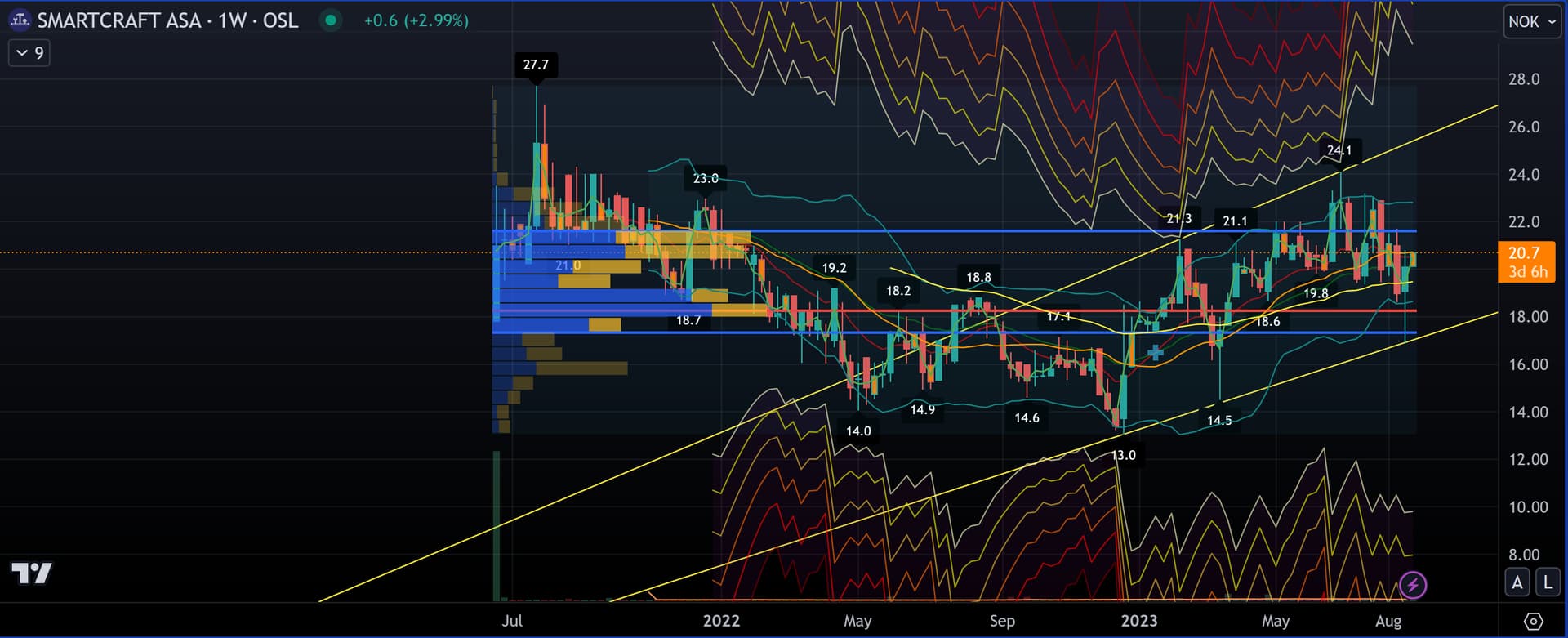 Tuossa oma näkemys pikaisesti - megaphone kertoo isosta kurssin liikkeestä tänä vuonna. Voi auttaa hahmottamaan mahdollista rangea jatkoon. POC on 18.25, value area low 17.35 ja value are high 21.6