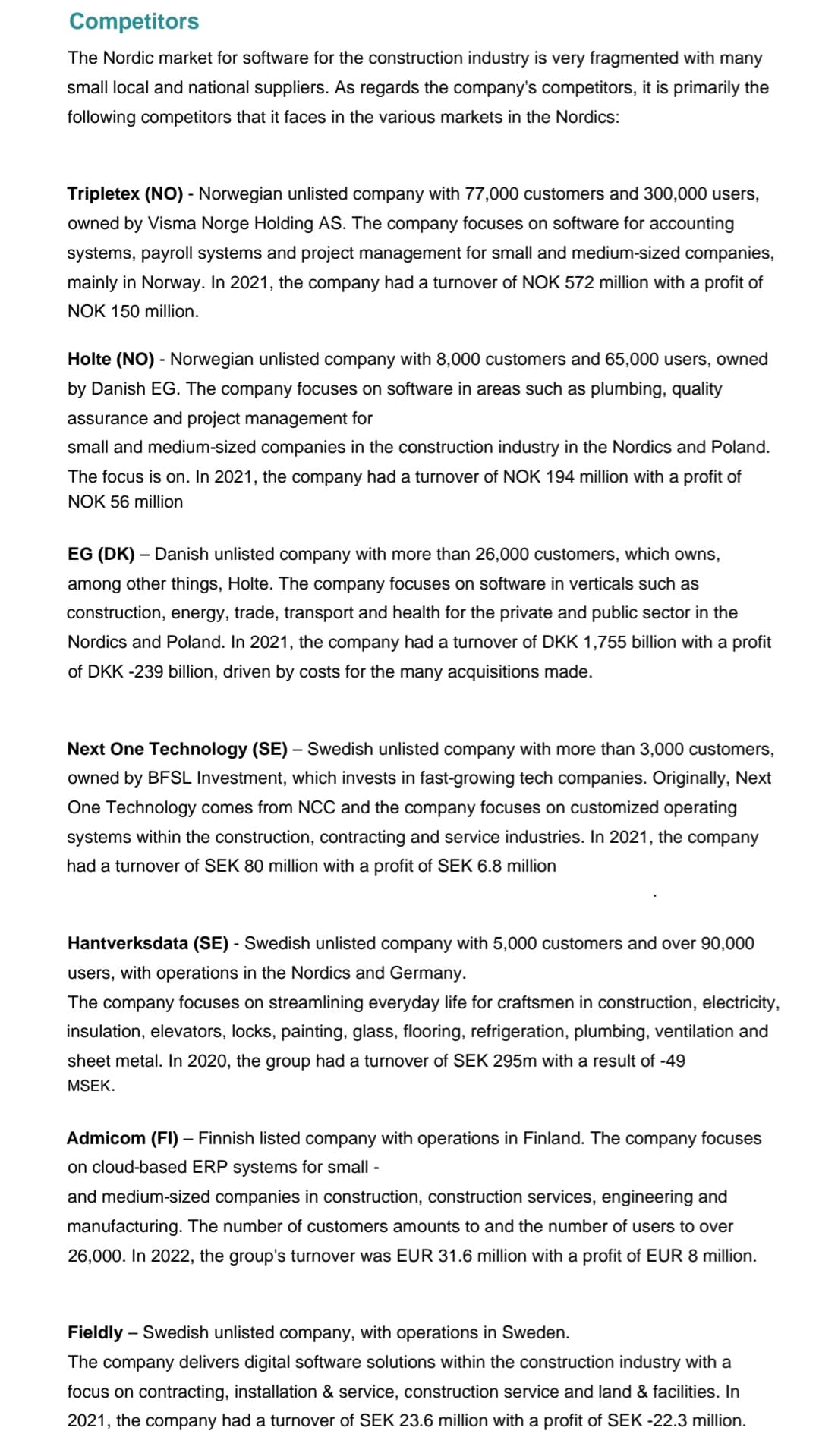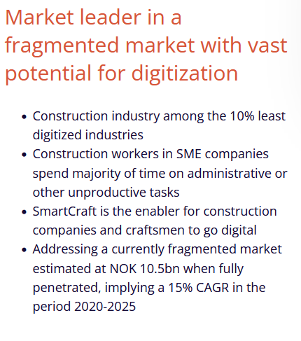 Vuonna 2021 Norjaan listautui Pohjoismaiden rakennussektorin johtava SaaS-yhtiö Smartcraft, jonka tavoitteena on kasvattaa digitalisten työkalujen käyttöä erityisesti pienissä ja keskisuurissa yhtiöissä. Yhtiöllä on toimintaa Norjassa, Ruotsissa ja Suomessa.