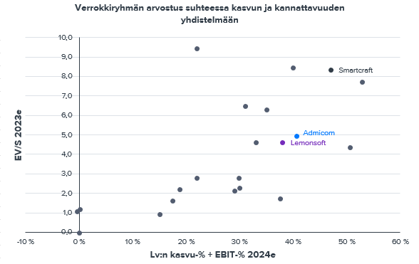 Jos arvostusta vertaa EV/EBITDA-kertoimella Admicomiin, niin kannattaa huomioida, että Smartcraft aktivoi tuotekehitysmenoja melko reippaasti taseeseen (tämän vuoden arvio 10-11 % liikevaihdosta). Admicom ei aktivoi kehitysmenoja, joten EV/EBIT-kertoimella arvostusten vertailu yhdenmukaisempaa.