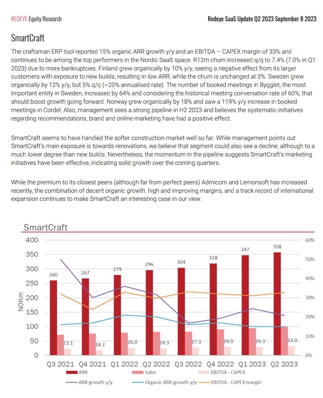Taitaa Suomen rakentamisen alho olla lannistanut keskustelun, mutta SmartCraft se vain porskuttaa. Tänään tulleet Q3-luvut olivat perinteisen vahvoja. ARR nousi 21 prosenttia, josta orgaanisen kasvun osuus oli 14 prosenttia. Kasvun vetureina oli tietysti Ruotsi ja Norja, mutta Suomenkin osalta ARR kasvoi orgaanisesti 4 prosenttia.