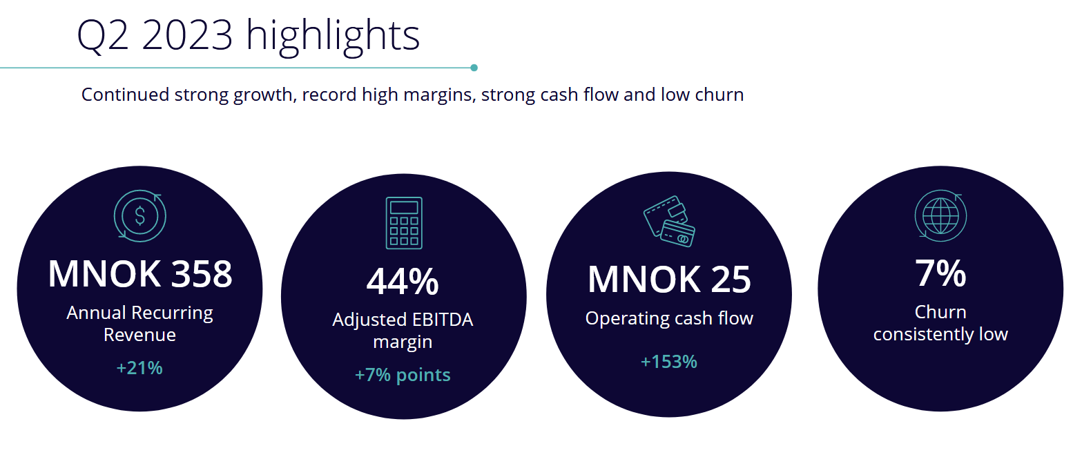 Raportoitu EBITDA margin nousi 3 prosenttiyksiköllä 42 prosenttiin. Kassavirta oli hyvä. Churnissa oli pientä kasvua, mutta tämäkin oli paranemaan päin kohti Q3 loppua. Näkymät positiiviset ja usko kannattavaan kasvuun on kova.