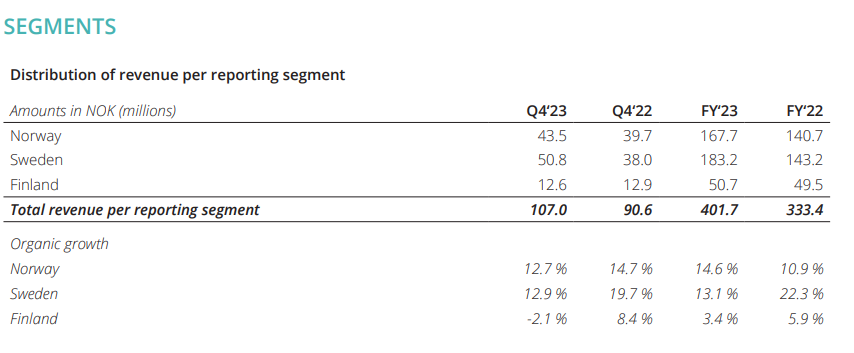 Raportoitu liikevaihto neljännellä vuosineljänneksellä oli 107 miljoonaa Norjan kruunua (+18 prosenttia), josta 97 prosenttia oli toistuvaa. Oikaistu ja raportoitu EBITDA-marginaali oli 39 prosenttia. Liiketoiminnan kassavirta oli 32 miljoonaa Norjan kruunua neljännellä vuosineljänneksellä, kun se edellisen vuoden vastaavalla jaksolla oli 29 miljoonaa Norjan kruunua. Koko vuoden 2023 liiketoiminnan kassavirta oli 153 miljoonaa, mikä on 32 prosenttia enemmän kuin vuonna 2022, ja nettotulos oli 115 miljoonaa, mikä on 71 prosentin kasvu. Neljännellä vuosineljänneksellä konsernin asiakaspoistuma (churn) oli 7,2 prosenttia, mikä on laskua vuoden 2023 kolmannen vuosineljänneksen 7,9 prosentista.