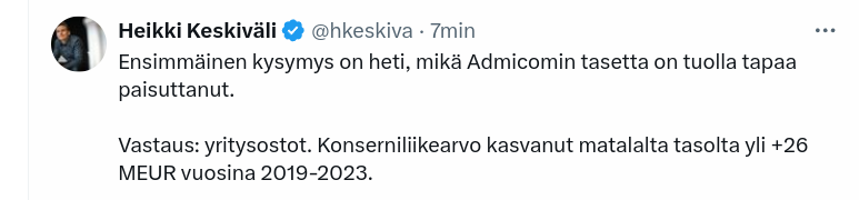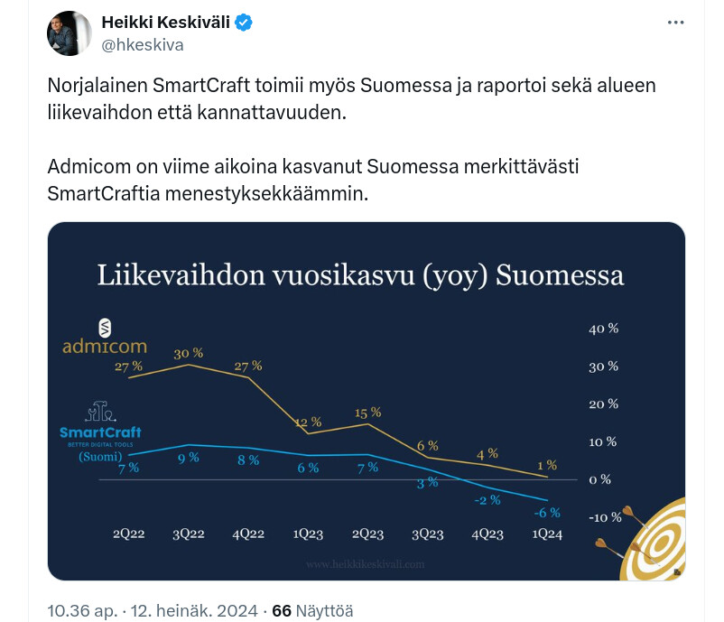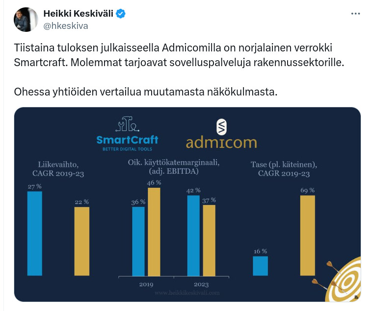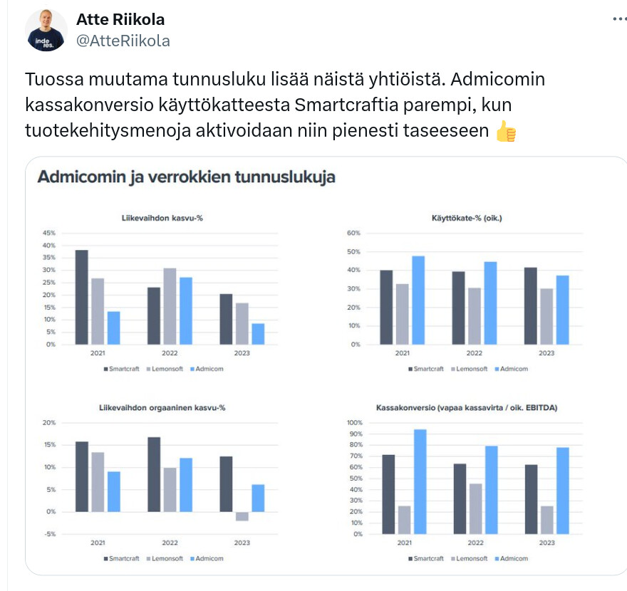 Katsoin vastaavat luvut Q3/2023 osalta. SmartCraftin liikevaihto oli 8,9 M€ ja 12 kuukauden rullaava ARR oli 32,6 M€. Admicomin vastaavat luvut olivat 8,5M€ ja 32,7 M€.