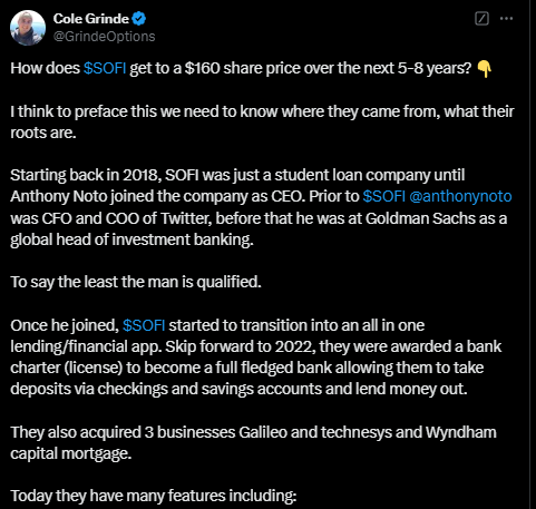Oli Felix & Friends tehnyt näemmä eilen videon SoFi:sta ja vaikka video onkin hyvin bullish, niin ihan katsomisen arvoinen pätkä silti. Lyhyellä aikavälillä katalyytteja tuntuu edelleen riittävän vaikka kurssi ottanut nyt aika voimakasta etukenoa.