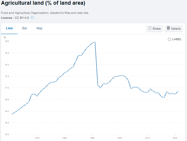 Nostat esiin hyviä pointteja. Tarkistin että World Bankin tilaston mukaan vuonna 2021 maapallon pinta-alasta 36,8 % oli maatalouden käytössä. Lukema on kasvanut noin yhden prosenttiyksikön 60-luvulta lähtien. Kun samalla väestön määrä on kasvanut 3 miljardista 8 miljardiin, tämän on täytynyt olla seurausta maatalouden tuottavuuden kasvusta. Näillä on biologiasta tunnettu kausaalinen yhteys: parempi ravintotilanne johtaa ceteris paribus populaation kasvuun.