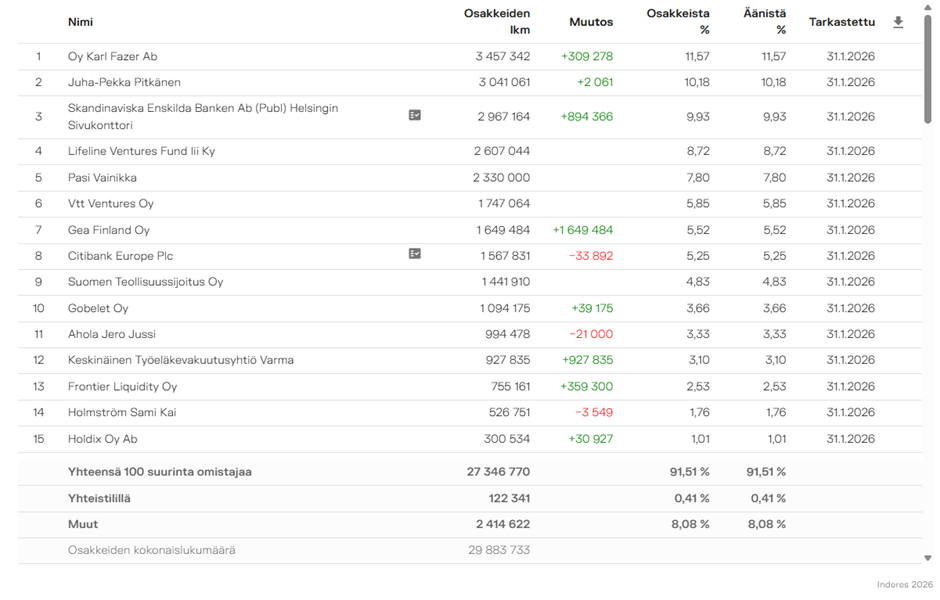 Solar Foods’ ejeroversigt fra slutningen af januar var særligt interessant i lyset af den nyligt gennemførte emission. Gea har som ankerinvestor i emissionen naturligvis øget sin ejerandel mest. Det er opmuntrende at se, at Solar Foods’ største ejer og strategiske partner Fazer deltog i emissionen, hvilket signalerer tillid til 02-fabriksprojektet. En betydelig andel er også gået til SEB’s forvalterregistrerede konti. Varma, Veritas og Yleisradion Eläkesäätiö er desuden kommet til som nye ejere. Pensionsselskabernes deltagelse er meget positiv, da de har helt andre ressourcer end gennemsnitsinvestoren til at støtte opstarten af et produktionsanlæg i industriel skala.