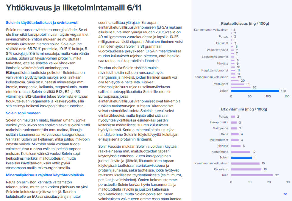 Av hemjärn absorberas 20-30 % och av icke-hemjärn, som Solein innehåller 95 %, absorberas 1-10 % [Dietary Determinants of and Possible Solutions to Iron Deficiency for Young Women Living in Industrialized Countries: A Review - PMC]. Företaget anger en siffra på under 5 %. Detta kan dock även vara 8 % med hemjärn, dvs. dubbla företagets uppskattning, särskilt eftersom det bara är en provrörsberäkning. Proteininnehållet är 75 %, så en proteinbar på 20 g (27 g Solein) skulle mycket väl kunna innehålla 2x företagets uppskattning på 128 mg absorberbart järn = 256 mg/100 g. Från baren skulle då 27x2,56=69 mg absorberbart järn, vilket är en mängd som överskrider maximala doser för alla och särskilt för de utsatta. Detta är nästan allt s.k. extra järn. Dessa absorptionsfrågor bör snarare överdrivas uppåt än vad Solar Foods kanske har gjort, nedåt, eftersom man måste följa försiktighetsprincipen i dessa fall.