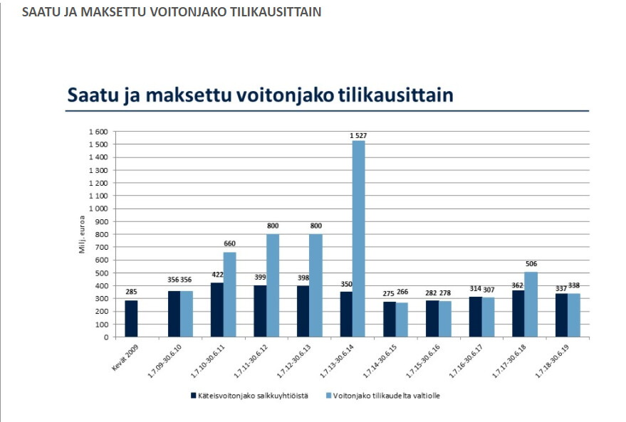 Ennen periaatteena oli kai, että osinko maksetaan kokonaisuudessaan (miinus kulut) valtiolle, ja osakemyyntien tuloilla piti ostaa uusia osakkeita. Mielestäni ihan hyvä periaate, toivotaan että olet väärässä.