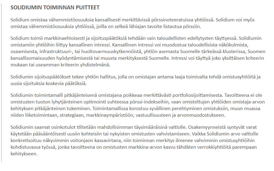 Perustettaessa idea oli kai viedä finanssisijoitukset pois politiikasta asiantuntijoiden käsiin, missä kai ainakin jollain tasolla onnistuttu. Toki Talvivaarat ja SSAB:t eivät tästä kerro, mutta tästä ei kai voi firman johtoa syyttää. Itse pidän tärkeänä, että Suomessa on Solidiumin kaltainen vahva ankkuriomistaja, mutta tämä toki vain oma mielipiteeni ja poliittinen kysymys.