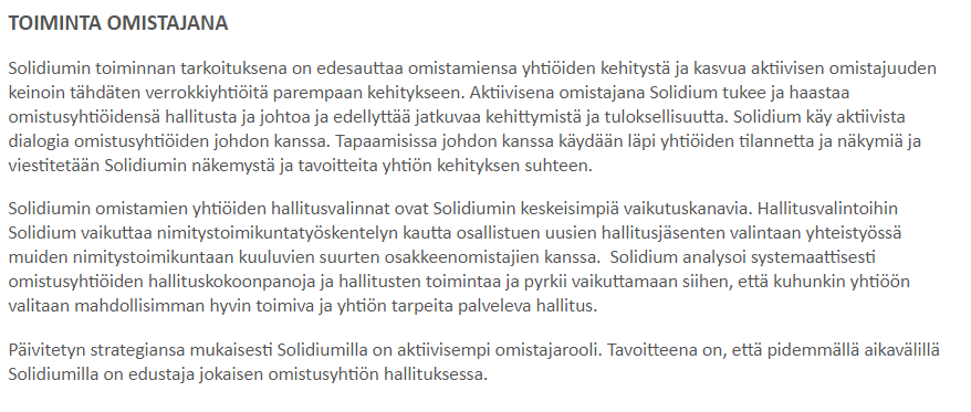 Officially, Solidium is a politically independent organization that operates according to its own strategy, with the goal of long-term growth in the value of its holdings.