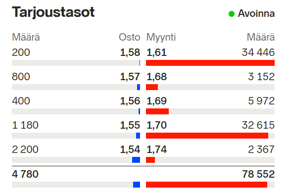 Onkohan tämä pörssin vähävaihtoisimpia lappuja? Eilenkin katsoin kuinka vaihto taisi olla jotain reilut 300 euroa. Päivä alkoi taas hyvin, kun joku onnekas halusi maksimoida kaupankäyntikulut ja osti kolmella eurolla osaketta