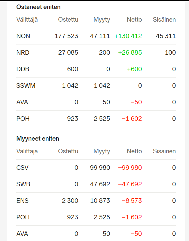 Nordnet-käyttäjät ottavat koppia, kun Swedbank (SWB) ja Credit Suisse (CSV) myyvät ihan olan takaa. Nyt jo suurin volyymi viimeiseen 3 vuoteen 200k+ lapulla, joista pelkästään Nordnet-tileille mennyt 177k lappua