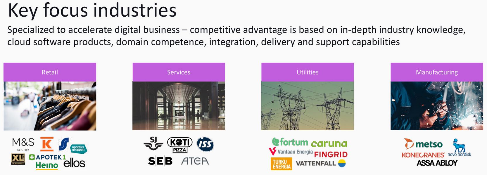 En tiedä isoimmista asiakkaista, mutta Retail on isoin segmentti ja Utilities kasvanut viimeiaikoina eniten ja on toiseksi isoin. Alla kuvassa asiakkaiden logoja