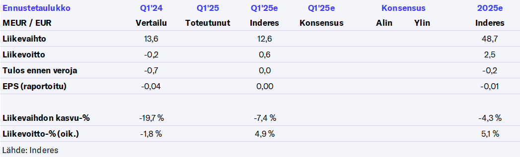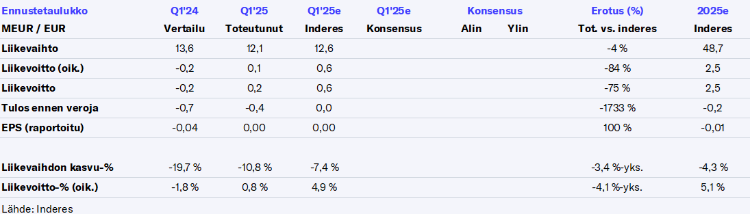 Bolagets omsättning under Q1 var 12,1 MEUR, vilket innebar en minskning med 10,7 % från föregående år. Analytikern hade förutspått en omsättning på 12,6 MEUR, det vill säga det faktiska beloppet understeg prognosen.