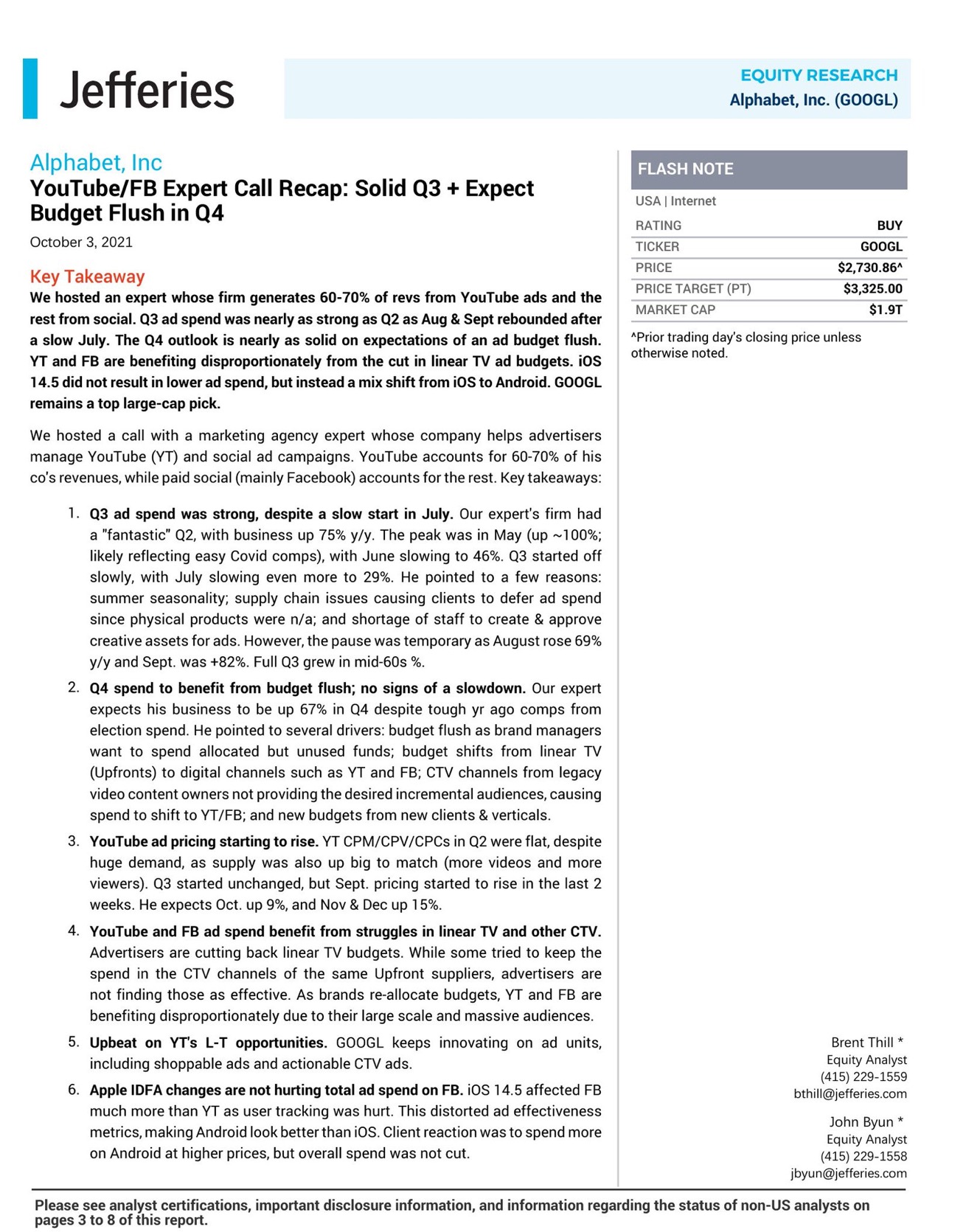 ”We hosted an expert whose firm generates 60-70% of revs from YouTube ads and the rest from social. Q3 ad spend was nearly as strong as Q2 as Aug & Sept rebounded after a slow July. The Q4 outlook is nearly as solid on expectations of an ad budget flush. YT and FB are benefiting disproportionately from the cut in linear TV ad budgets. iOS 14.5 did not result in lower ad spend, but instead a mix shift from iOS to Android. GOOGL remains a top large-cap pick."