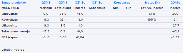 Sotkamo Silveriltä vaikeasti tulkittava Q3-raportti. Liikevaihto oli vahva ja käyttökate hakkasi ennusteemme kirkkaasti, vaikka hopean tuotantomäärä jäi hieman odotuksistamme (Q3: hopean tuotanto 358 koz vs. ennuste 373 koz). Suurista poistoista huolimatta EPS ylsi plussalle. Toisaalta rahavirta oli heikkolla vain 7 MSEK:n tasolla ja kassa on yhä ohut (Q3:n lopussa 7 MSEK). Tuotanto-ohjeistus laski lievästi 1,0-1,1 miljoonaan hopeaunssiin (aik. 1,15-1,25 Moz), kuten olemme arvioineet.