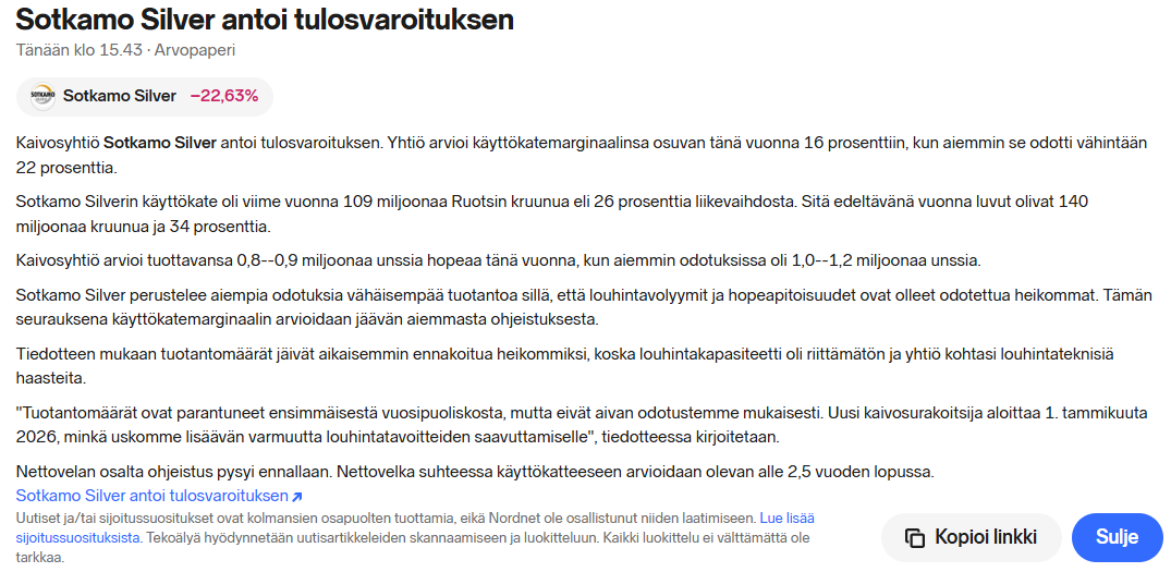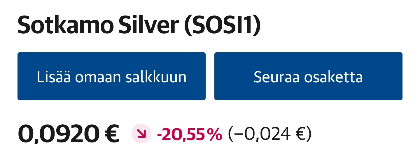 Ei näy erityisemmin laskupaineita hopean hinnassa ainakaan hetkeen. Kairaustuloksista yhtiö kertoi Q3:ssa, että “Alustavat tulokset ovat positiivisia”. Tosin mitä positiivinen tarkoittaa Sotkamon kaltaiselle yhtiölle, se on kysymysmerkki.