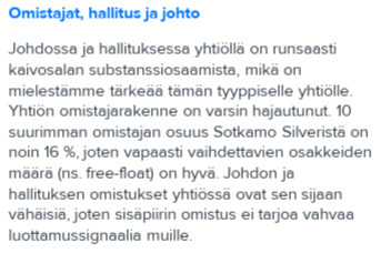 Tämän merkittävyydestä näkemykset varmasti vaihtelevat ja tietysti on olemassa myös muita sitouttamisen keinoja (esim. erilaiset tulospalkkiomallit). Mutta kyllähän johdon/hallituksen omistukset kuitenkin signaaliarvoa antavat, ja mahdollisen omistuksen myötä intressit ovat näiltä osin vahvasti yhteneväiset muiden osakkeenomistajien kanssa (ts. skin in the game) ja itse ainakin tulkitsen omistukset yhtiössä positiivisena asiana. Tämän osalta ei kuitenkaan kannata laittaa suoraan yhtäsuuruusmerkkiä lopputuloksen (hyvä/huono, jotain siltä väliltä) kanssa. Tästä aiheesta voi varmasti debatoida myös esimerkiksi siitä, millainen omistusosuus olisi optimaalinen taso muiden osakkeenomistajien kannalta, eikä tähän varmaan löydy suoraa vastausta yhtiökohtaistenkin erojen vuoksi.