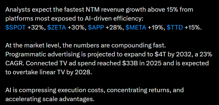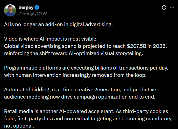 Alla olevasta tviitissä ilmaistaan ettei tekoäly ole enää pelkkä lisäominaisuus, vaan se voi hoitaa digimainonnan ja videon tekemisen melkein kokonaan. Data jyrää ja alan jättien massivirrat kasvaa kohisten, isoilta osin manuaalinen säätö jää historiaa, kun "koneet "optimoi kaiken.