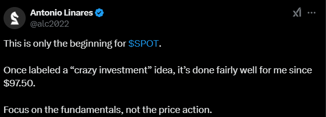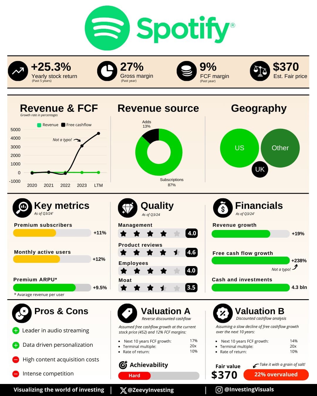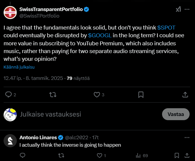 Spotify on kovin suosittu, sillä on valtava käyttäjäkunta, mutta edelleen kasvaa ja sillä on vielä mukavasti lisääkin potentiaalia ottaa uusia asiakkaita. Yhtiö on rohkeasti monien mukaan investoinut runsaita summia teknologiaan, joka varsinkin pitkässä juoksussa tarjonnee kilpailuetuja ja vallihaudan syvennystä.