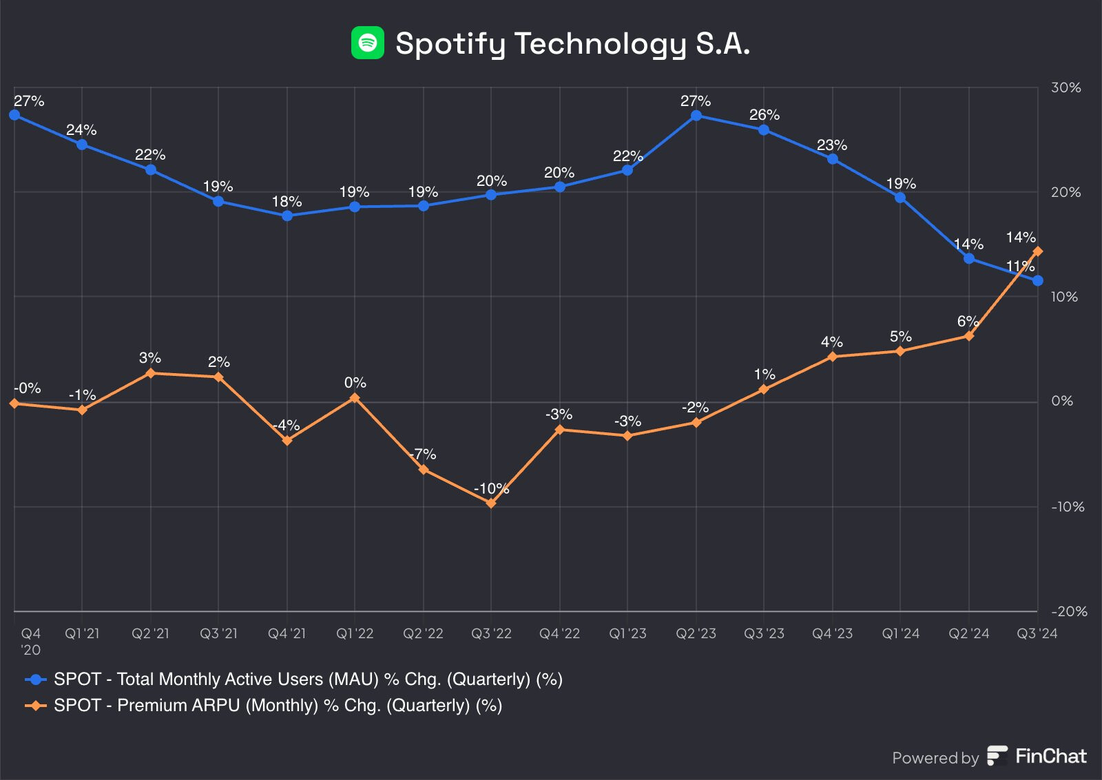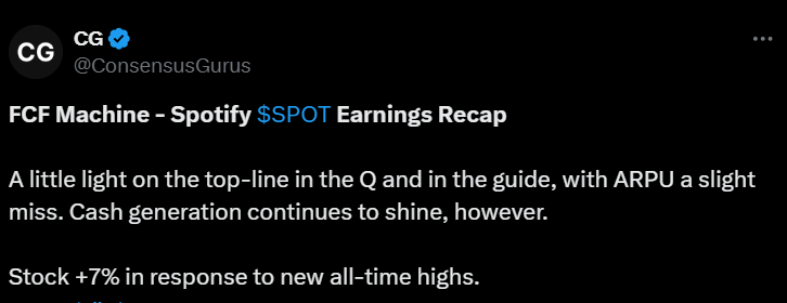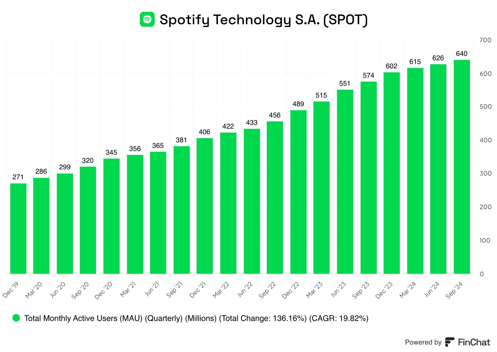 Spotify on ruotsalainen äänen suoratoistopalvelu ja mediapalvelun tarjoaja, jonka perustivat Daniel Ek ja Martin Lorentzon vuonna 2006. Se on yksi suurimmista musiikin suoratoistopalveluiden tarjoajista maailmassa, ja sillä on yli 626 miljoonaa kuukausittaista aktiivista käyttäjää, joista 246 miljoonaa on maksavia tilaajia (2024/6).
