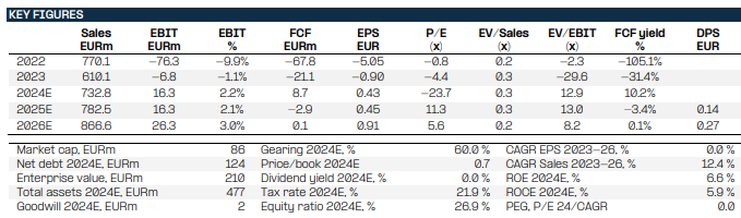 We estimate net sales of EUR 733m and operative operating profit of EUR 10.2m for 2024E. We expect y/y revenue growth for Q4/24 driven by continued growth in non-residential while we expect residential net sales to decline. For Q4 operative EBIT, we forecast EUR 3.0m with margin of 1.5%. Although we project revenue growth, we anticipate that profitability will remain comparable to last yearâs figures due to the project mix. We expect positive NRIs to boost reported EBIT related to the companyâs sale of remaining stake in Pearl Plaza. For 2025E we estimate similar development to 2024, yet we expect that the company is able to sell some of its unsold residential inventory. With non-residential driven project mix in 2025, the margin potential remains limited.