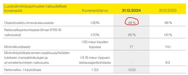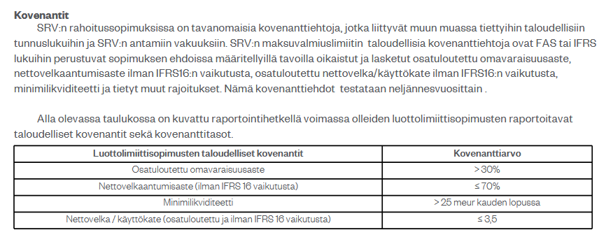 According to my understanding, the equity ratio is calculated without the impact of IFRS 16 in the company’s covenants. Based on my preliminary calculations, in the scenario you described, the company’s equity ratio excluding IFRS 16 would meet the covenant requirements. The calculation naturally includes, for example, the completion of the SRV Infra transaction.