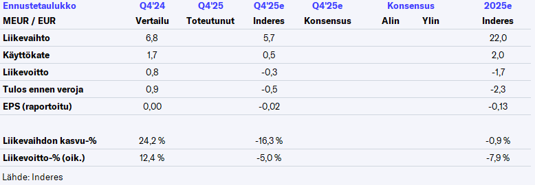 Pengestrømmen fra driftsaktiviteter var 1,1 millioner euro (2,7 millioner euro). Selskabets soliditetsgrad var 78,7 % (52,8 %), og likvide beholdninger, herunder kortfristede likvide investeringer, var 21,0 millioner euro (2,9 millioner euro).