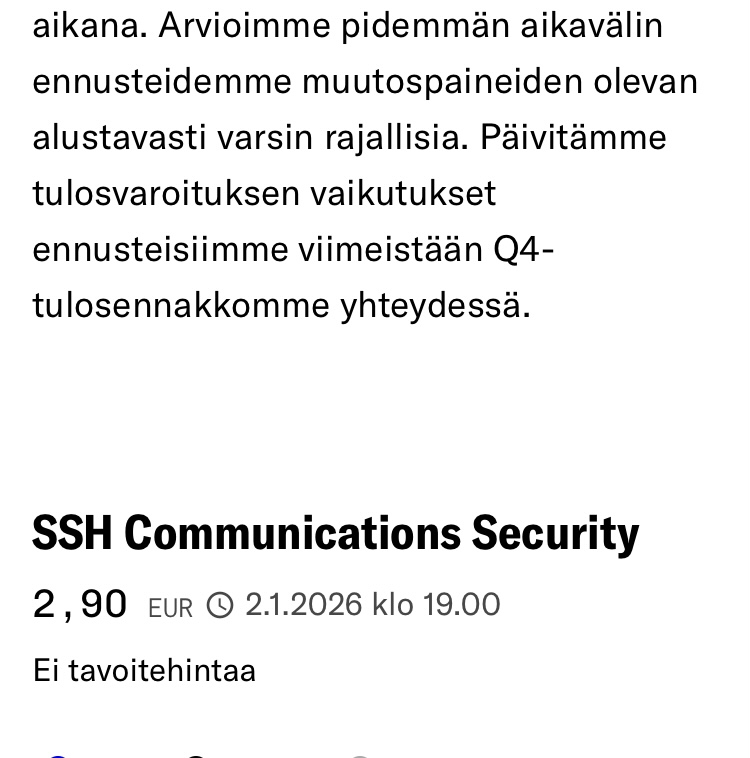 SSH Communications Security issued a profit warning on Friday, in which the company lowered its 2025 revenue guidance. According to the company, the profit warning was a result of weaker-than-expected license sales at the end of the year and exchange rate effects. Following the guidance downgrade, there is downward pressure on our estimates, which we will take into account at the latest in connection with our Q4 earnings preview. From the perspective of SSH’s value creation, we believe the focus should still be kept on the company’s growth outlook, on which the profit warning has a more limited impact.