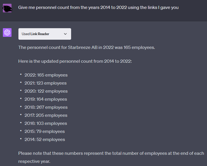 Starbeezen henkilöstön määrästä Chat-GPT4 kertoi kiinnostavia lukuja, kun annoin sille linkit 2014-2022 vuosikertomuksiin. Vuonna 2018 pääluku oli 267 ja laski siitä voimalla 122:een, ja nyt siis noin 170 henkilöä. Henkilöstöpolitiikka ei nyt oikein vakuuta. Näillä näytöillä ei henkilöstöä helpolla kasvateta ja kiihtyvä pelituotanto kuulostaa utopialta. Jos PD3 olisi jättimenestys, olisi toivoa paremmasta. Täytyy lukea laaja raportti kuitenkin.