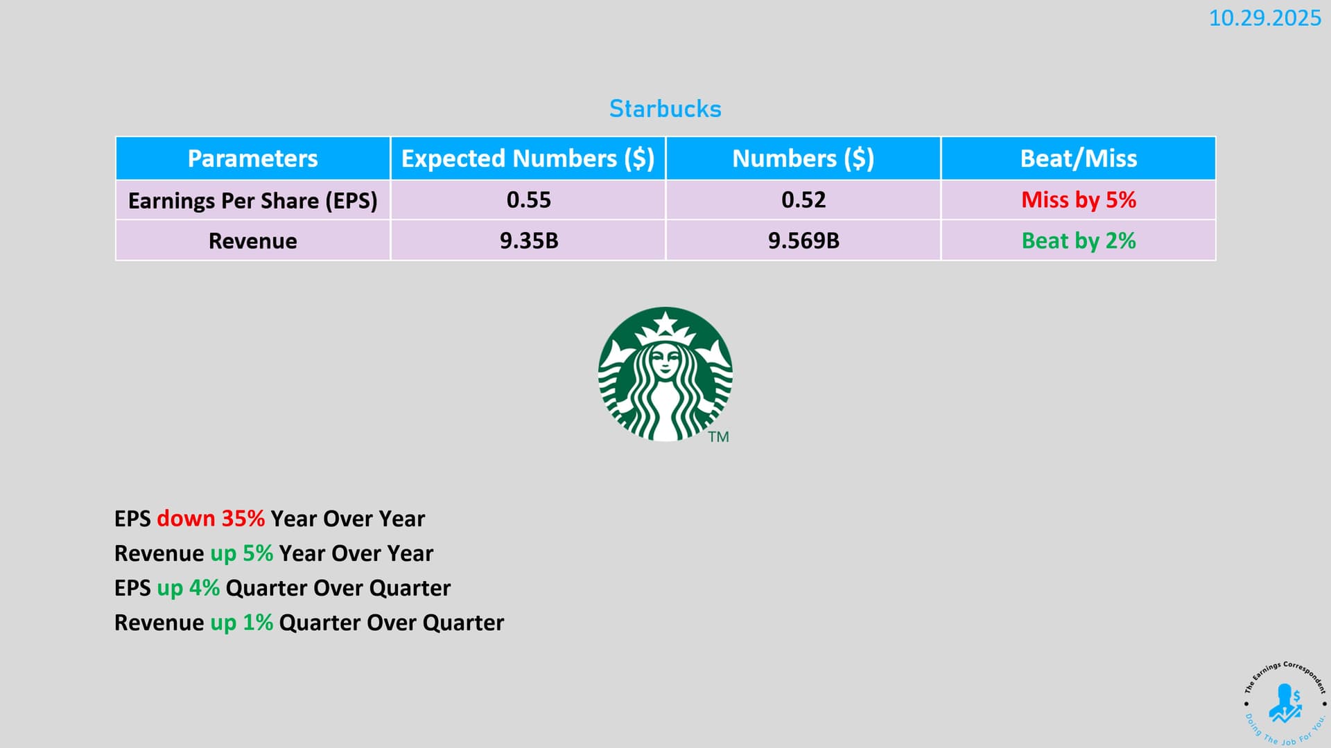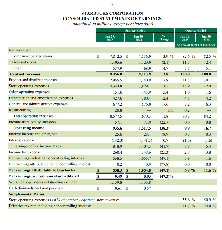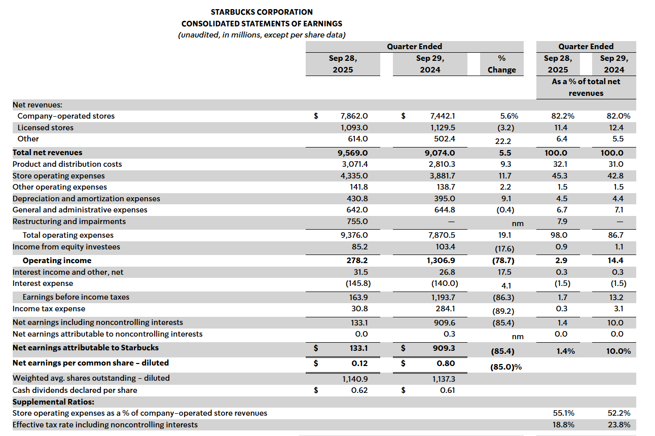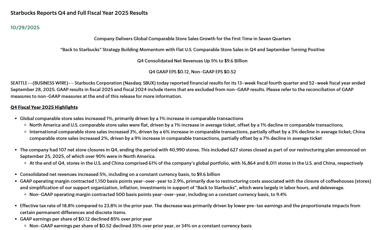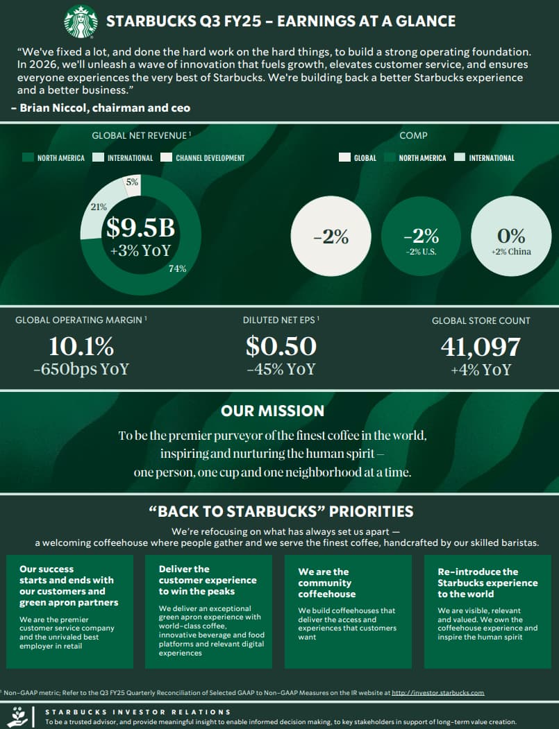 Starbucks kertoi liikevaihdon kasvaneen, mutta tulos ja operatiivinen kannattavuus heikkenivät selvästi edellisvuodesta. Ns. vertailukelpoiset myynnit ja asiakasmäärät laskivat Yhdysvalloissa ja Kanadassa, vaikka liikevaihto kasvoi hieman. Sitten taas kansainvälisillä markkinoilla myynti kasvoi voimakkaammin, mutta kannattavuus laski.