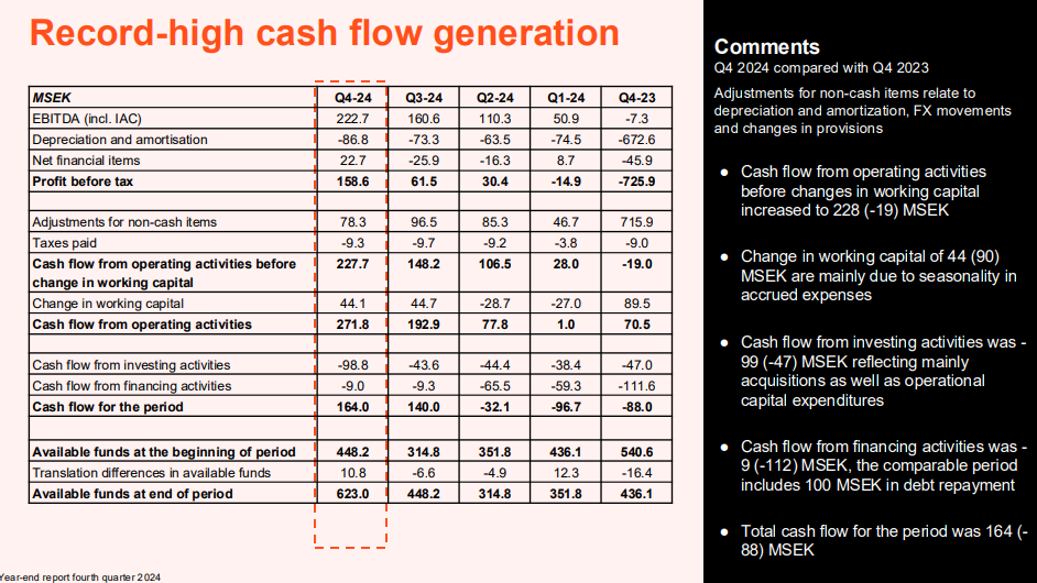 Cash flow from operations before changes in working capital increased to 203 (148) MSEK.