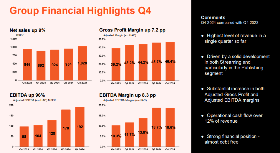 - Growth has been steady, although there was a dip compared to the previous quarter (the larger drop was, in my opinion, on the publishing side, about -50M SEK, where seasons have a greater impact)