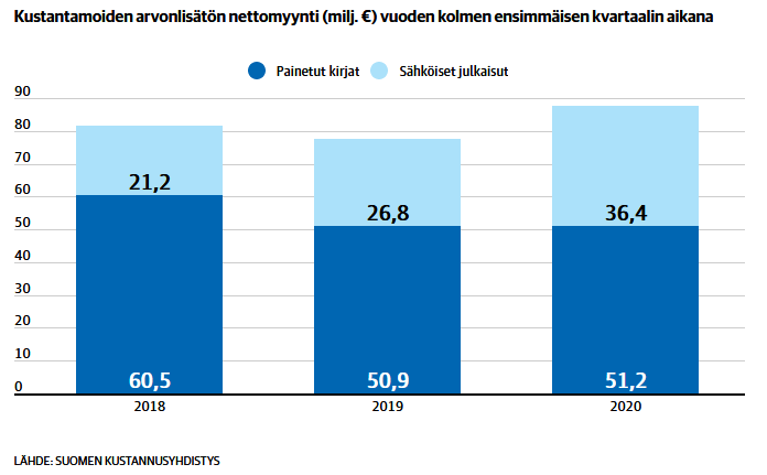“Suomen Kustannusyhdistyksen tilastojen mukaan kolmen ensimmäisen kvartaalin myynti on melkein 13 prosenttia viime vuoden vastaavaa lukua edellä. Erityisen harppauksen on ottanut digitaalinen kauppa. BookBeatissä , Storytelissä ja muissa lukuaikapalveluissa Suomessa julkaistun kirjallisuuden tammi-syyskuun myynti on 119 prosenttia enemmän kuin viime vuonna samaan aikaan.”