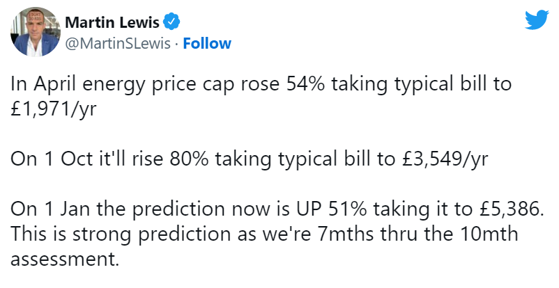 Lisätään vielä, että 400£/vuosi on tulossa tukea ja ehkä Johnson vielä jostain kaivaa lisääkin. Ja vielä uusimman ennusteen mukaan energialasku huhti 2023 olisi 6600£/vuosi, mikä on melkoinen nousu tämän vuoden huhtikuun 1971£/vuosi tasosta.