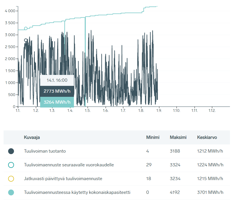 Hyvin on Suomessa kapasiteetti noussut tuulivoimassa, mutta niin kuin kaikki tietää varsinainen toteutunut tuotanto on kaukana teoreettisesta kapasiteetista. Keskiarvo tältä vuodelta toteutunut 1212 MWh/h, kun teoreettinen kapasiteetti on 3701 MWh/h.