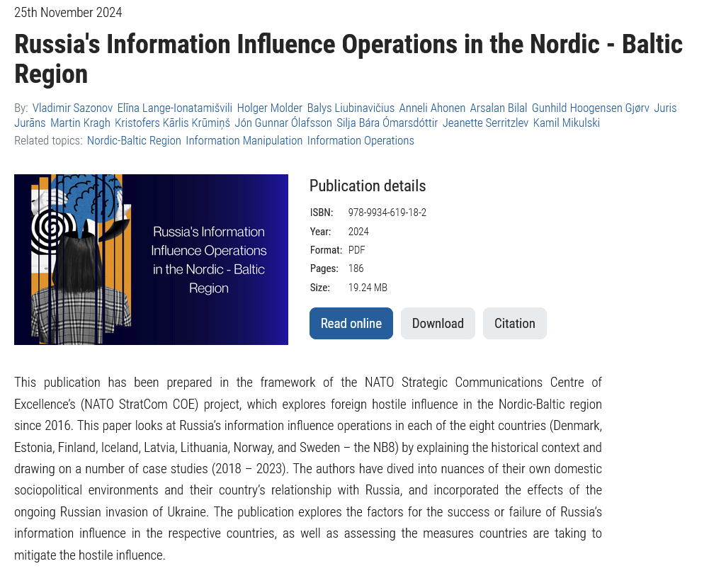 Tämäkin voisi kuulua tuohon Venäjän aggressiot -ketjuun, mutta laitan tänne Nato sisällön vuoksi. Naton tuore julkaisu Venäjän informaatiovakuttamisoperaatioista Pohjoismaissa ja Baltiassa. Suosittelen tätä iltalukemiseksi vaikka kotona perheen kesken, vaikka alle kouluikäiset eivät ehkä saa siitä syvintä ymmärrystä.