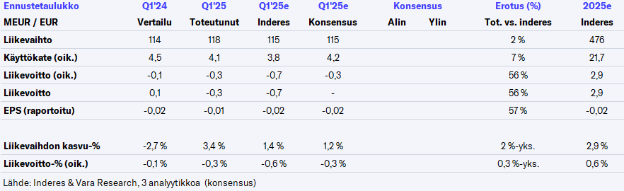 Suominen will report its Q1 results on Wednesday around 9:30 AM. We expect Suominenâs adjusted EBITDA to weaken slightly from the comparison period and to be roughly at the level of the two preceding quarters. The guidance for an improving 2025 adjusted EBITDA is likely to remain unchanged. At the net income level, we expect a loss for both Q1â25 and the full year, similar to the previous three years.