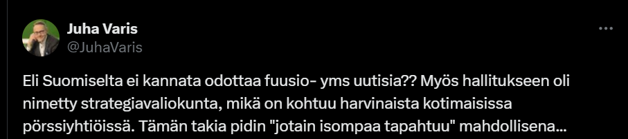 From Suominen, in connection with Thursdayâs results, we will this time get an interview with CFO Janne Silonsaari, who has served as acting CEO for the summer. If you have any questions in mind for them, please send them in.
